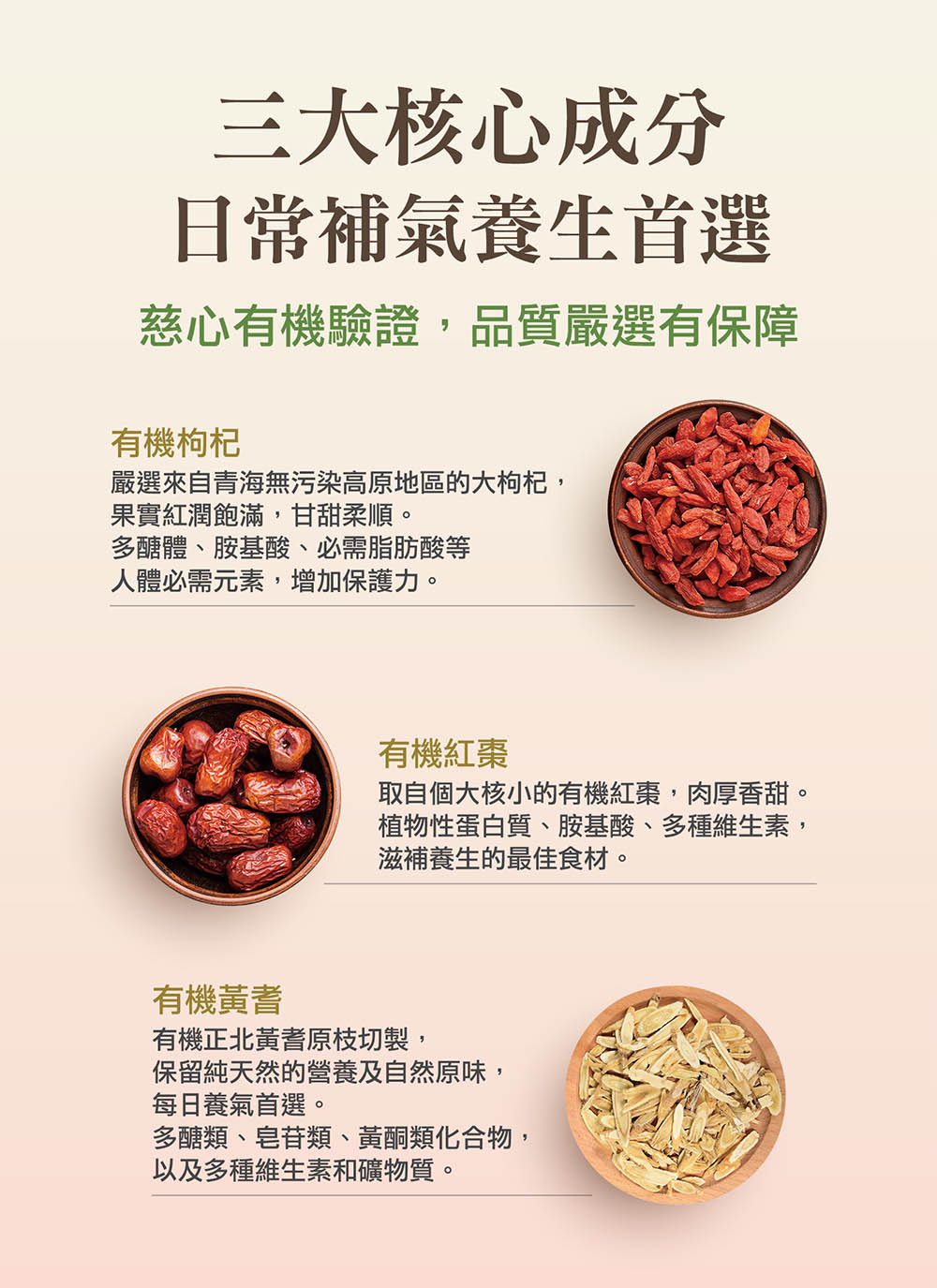 成分 | 有機黃耆(中國)、有機紅棗(中國)、有機枸杞(中國) |