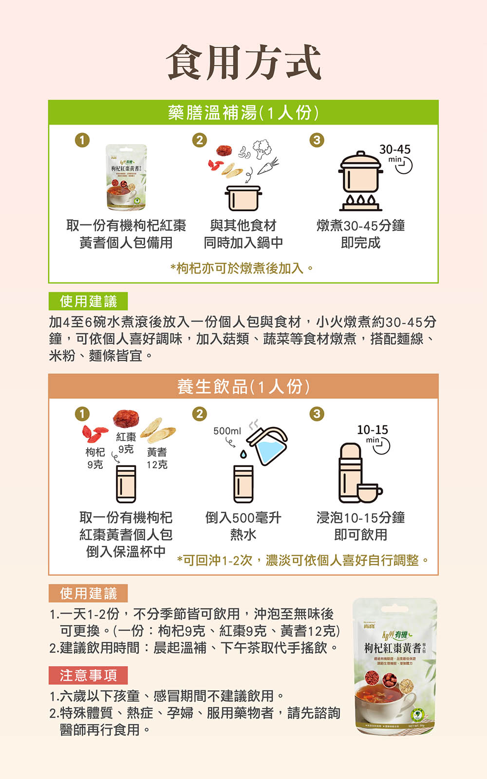 食用方法 | 一、藥膳調理包方式:加4至6碗水煮滾後放入個人包與食材,小火燉煮約30分鐘,依個人喜好調味,可加入菇類、蔬菜等食材燉煮,搭配麵線、米粉、麵條皆宜。 二、沖泡飲用方式:將個人包倒入保溫杯中,加入約500c.c.熱開水沖泡,浸泡15分鐘即可飲用。 |
