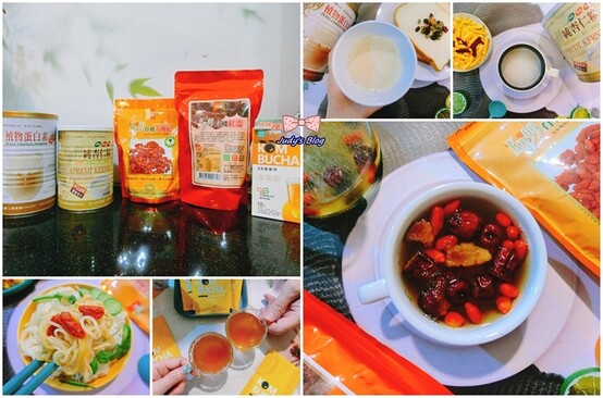 包括植物蛋白素、純杏仁粉、KB康普茶、KB99有機大紅棗與KB99有機大枸杞,都是我們日常所食、所飲的好物喔