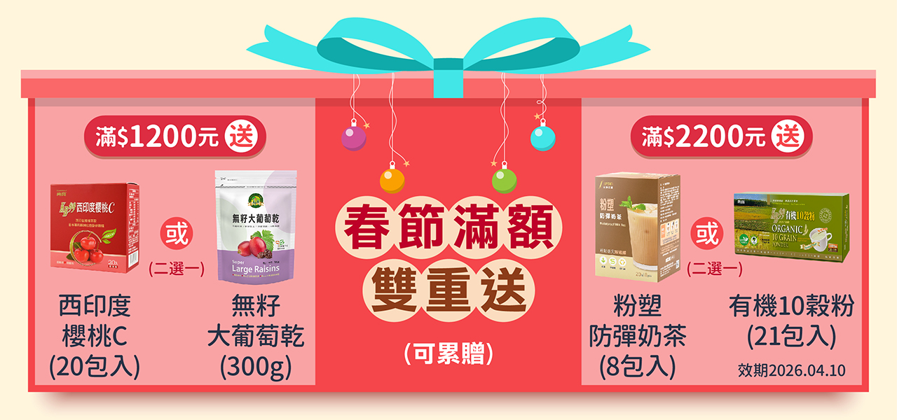 ★滿$1,200 贈『西印度櫻桃C』或『無籽大葡萄乾』。